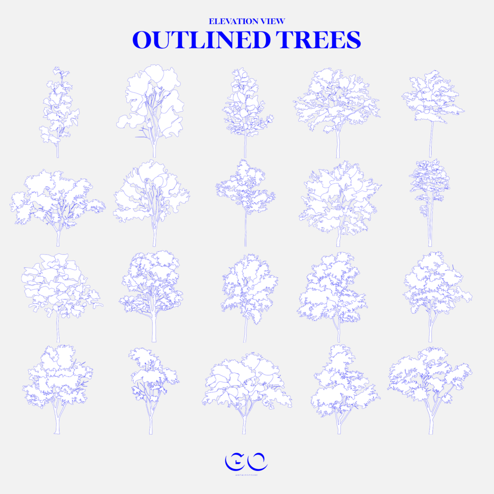 The OUTLINED TREES pack is a collection of 20 clean tree outlines for architectural representations in elevation view. These simplified yet realistic tree outlines add natural beauty and visual impact to designs, enhancing the overall composition and helping clients visualize the project's aesthetics and environment.